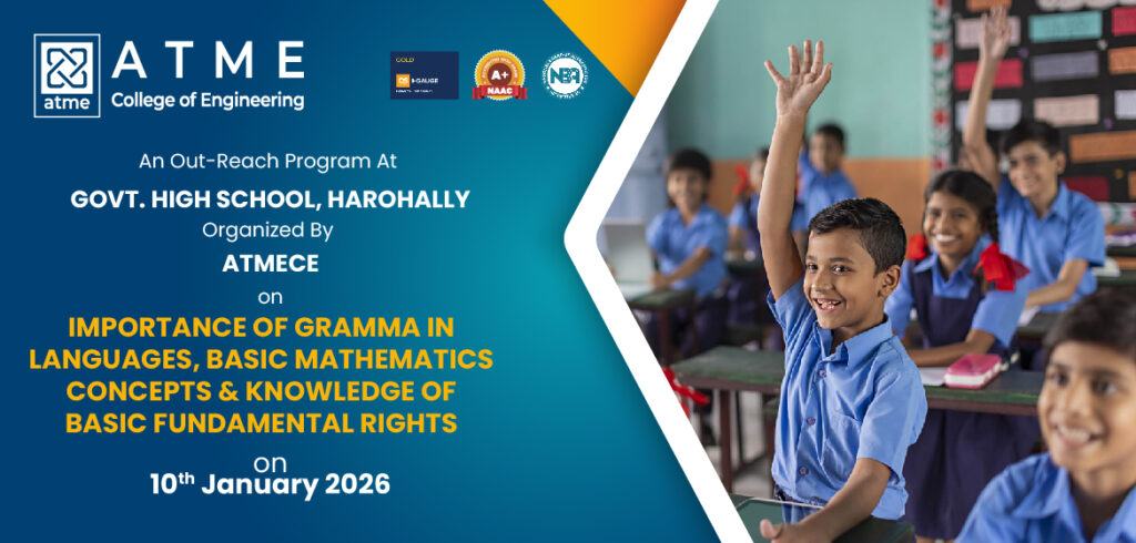 ATME College of Engineering Mysuru, established in 2010, is recognized by AICTE New Delhi and affiliated to Visvesvaraya Technological University, Belagavi, Karnataka. The college offers 11 undergraduate programs and two postgraduate programs. ATMECE has been accredited by the National Board of Accreditation (NBA). ATMECE is NABL accredited under ISO/IEC 17025:2017 for Civil Engineering Laboratory.