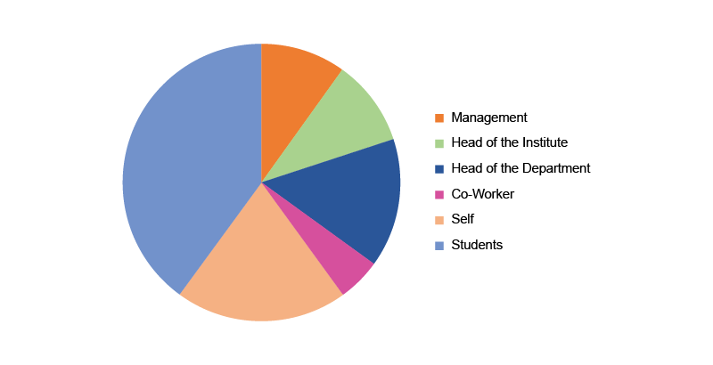 In academic Institutions, students are the main stakeholders. Hence, maximum weightage i.e., around 200 marks is allotted for students. Students’ feedback and students’ performance are the two different criteria that are considered for evaluation and both are given equal weightage. Students’ feedback includes parameters like subject preparedness, presentation and communication skills, knowledge about the subject, explaining the practical applications, using innovative teaching methodologies etc.