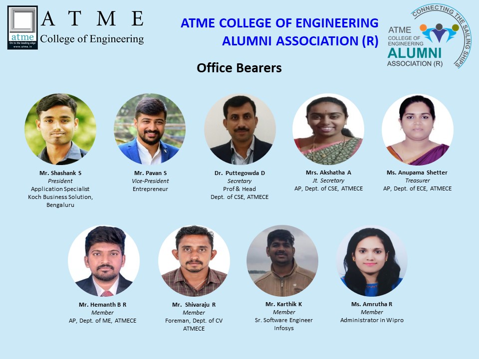 The ATME College of Engineering Alumni Association was started in 2015 with the clear objectives. The ATME College of Engineering Alumni Association was registered under Karnataka Societal Act-1960 in the year 2021.